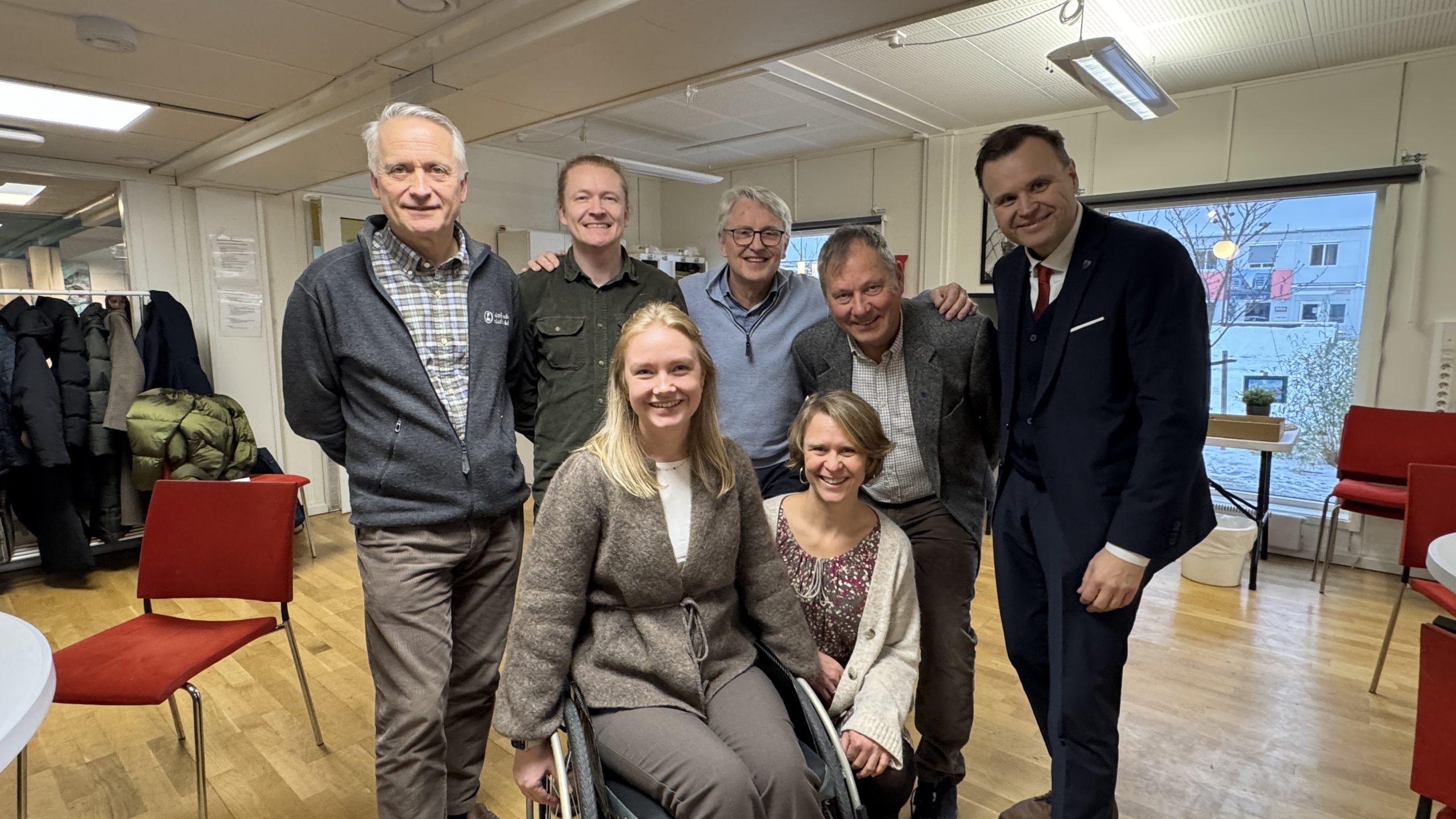 En glad gjeng på prisutdelingen. Fra venstre OFs direktør Espen Søilen, prosjektmedarbeider Thomas Haraldseid, Kay Arne Sørensen fra Rådet for personer med nedsatt funksjonsevne Asker kommune, styreleder i OF Øivind Sjuls og fylkesordfører Thomas Sjøvold. Foran leder for rådet i Akershus fylkeskommune Josefine Rørvik Skåland og prosjektleder i OF Jorunn Kveim Låte.